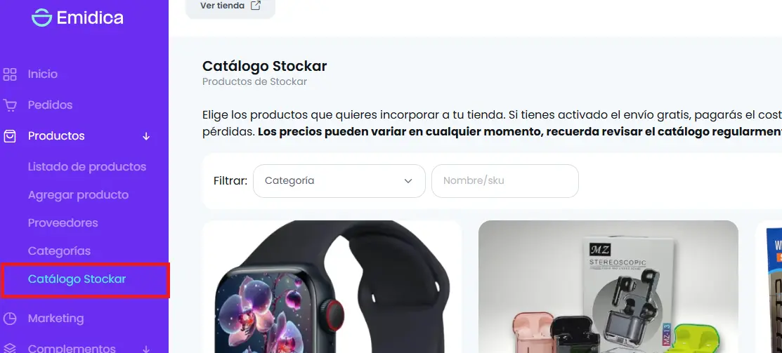 1. Ve al catálogo de Stockar: En el menú lateral izquierdo, busca y selecciona la opción "Productos". Dentro de esta sección, encontrarás una opción que dice "Catálogo Emidica".