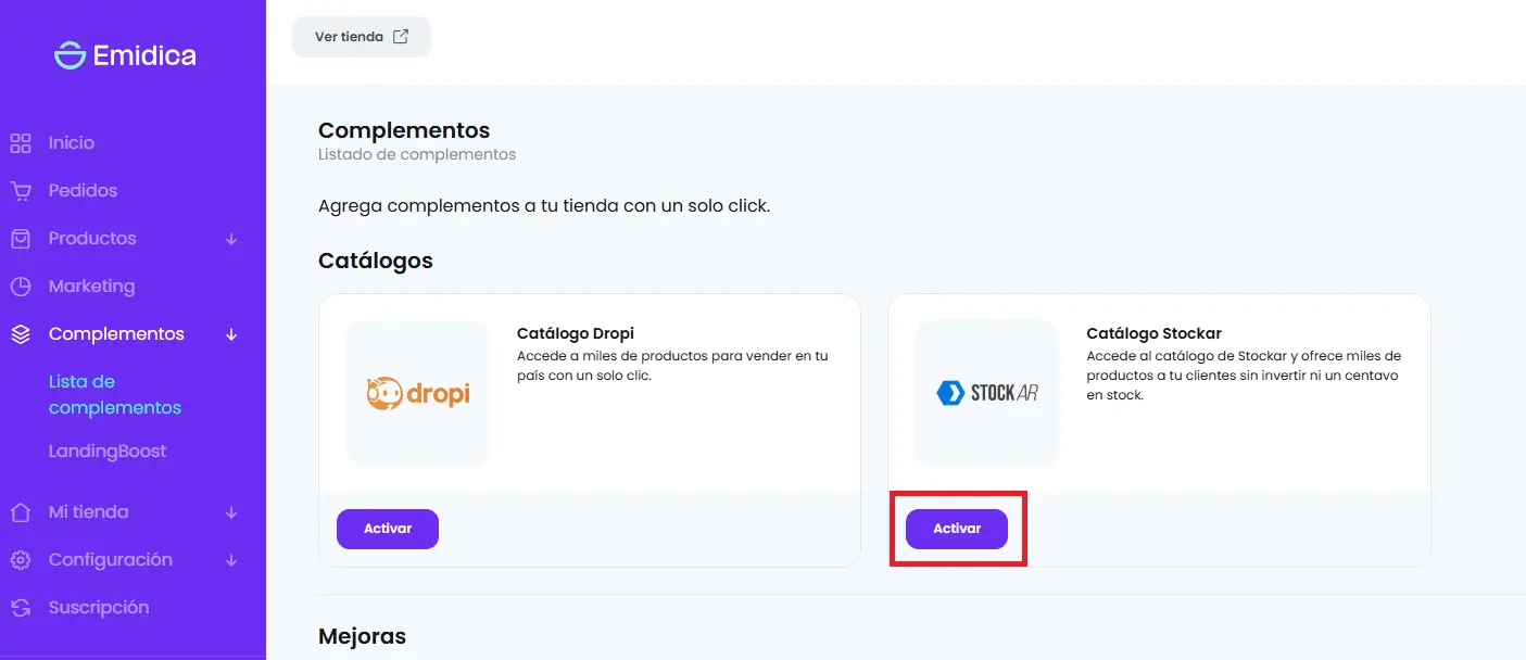 Localiza el catálogo de Stockar, verás una opción para activarlo. Haz clic en el botón de activar.