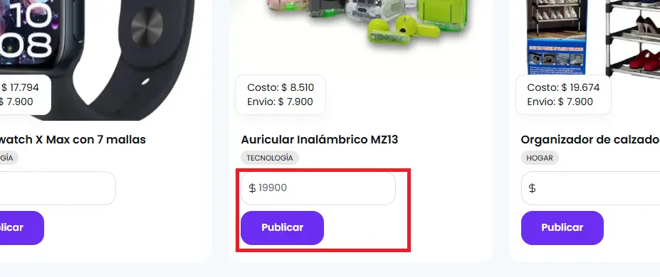 3. Selecciona los productos: Para agregar un producto a tu tienda, simplemente escribe el precio que deseas cobrar y haz clic en el botón “Publicar” que se encuentra junto a cada producto.
