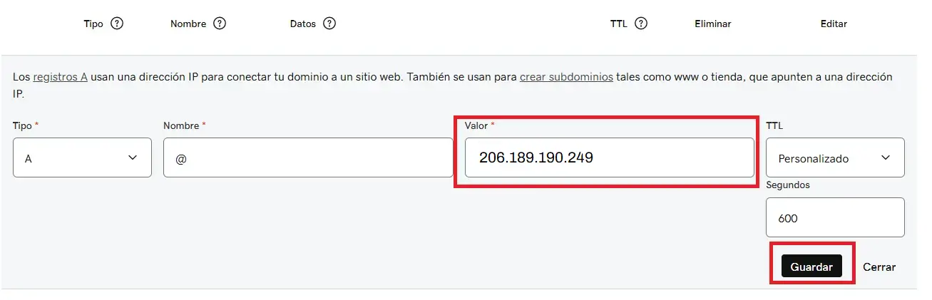 En el campo "Valor", borra lo que aparece (como parked) y reemplázalo por la IP de Emidica: