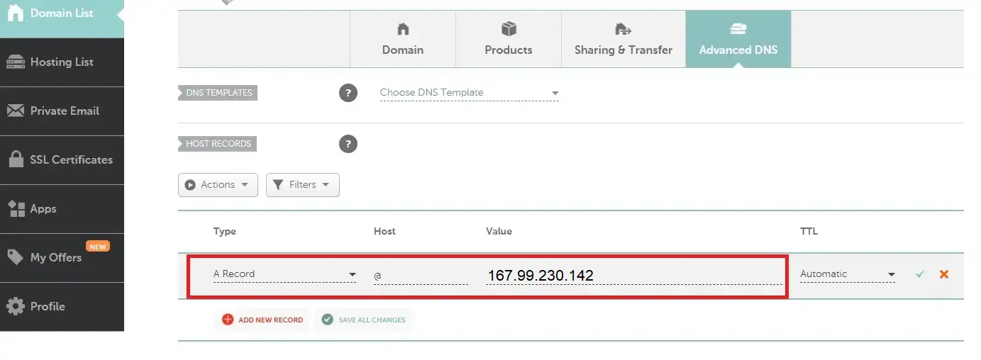 En la sección "Host Records", haz clic en "Add New Record" para agregar un nuevo registro.